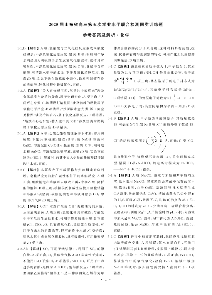 山东省齐鲁名校联考2024-2025学年下学期高三联合检测(五)化学答案