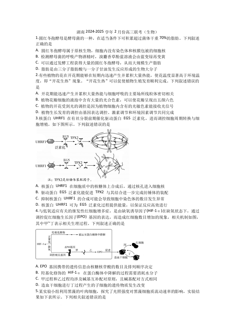 湖南省区域高中2024-2025学年下学期2月高三联考生物