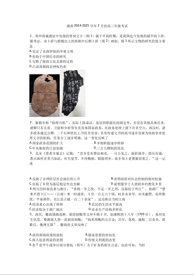 湖南省区域高中2024-2025学年下学期2月高三联考历史