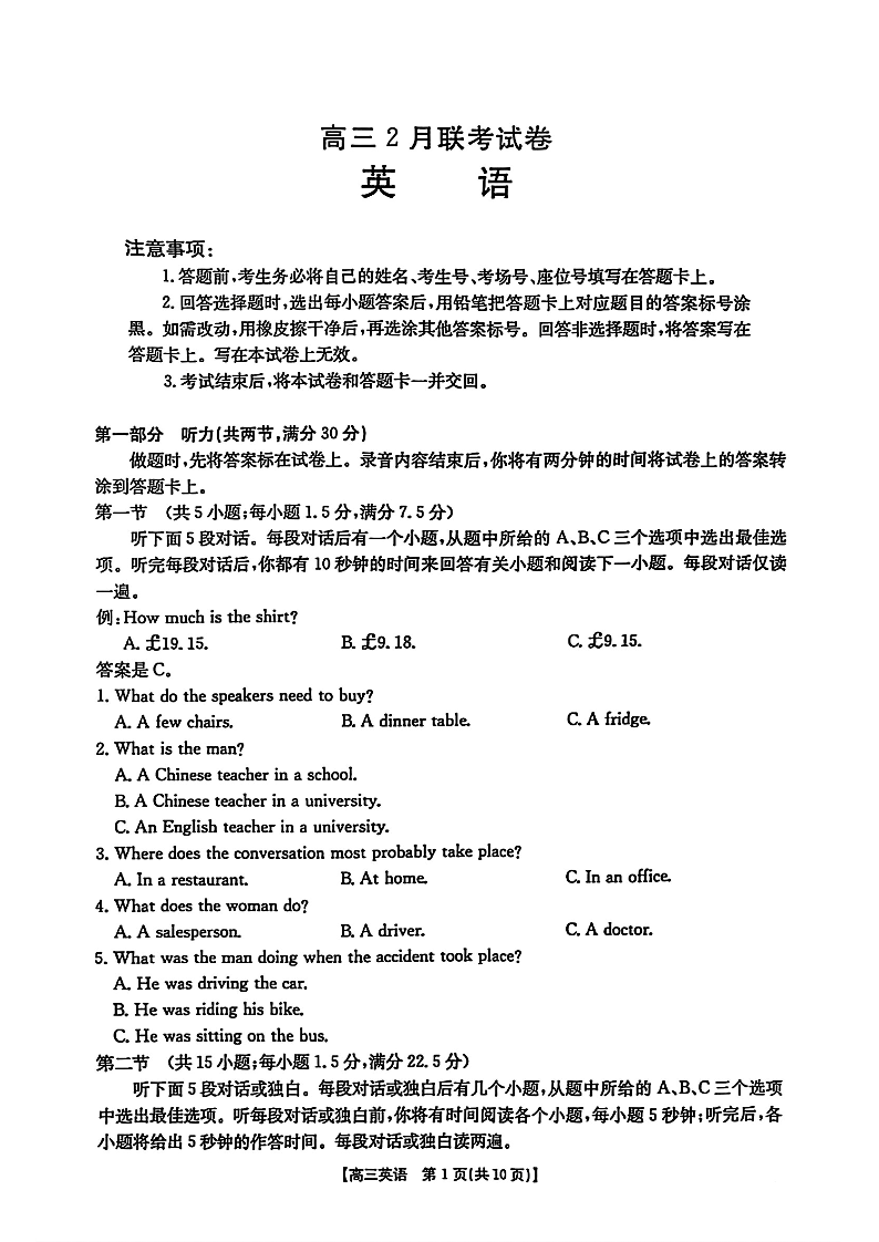 湖北省鄂东新领先协作体2024-2025学年下学期2月高三调考英语+答案