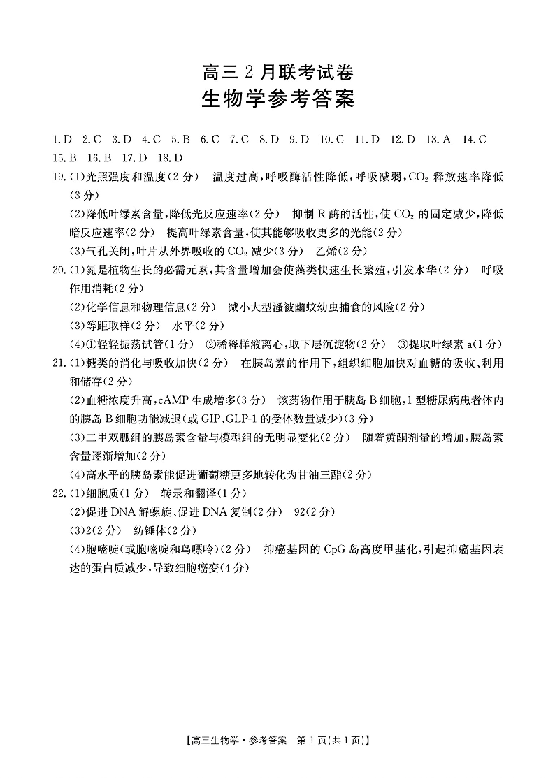 湖北省鄂东新领先协作体2024-2025学年下学期2月高三调考生物答案