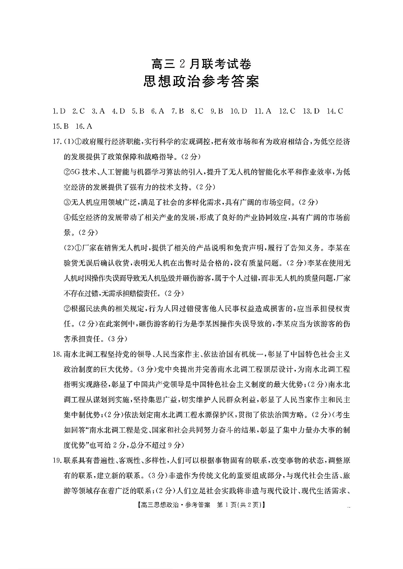 湖北省鄂东新领先协作体2024-2025学年下学期2月高三调考政治答案