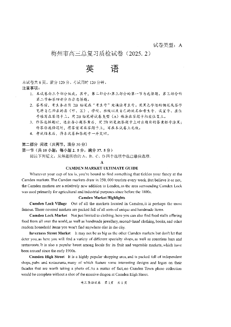 广东省梅州市2024-2025学年下学期高三模拟预测(一)英语