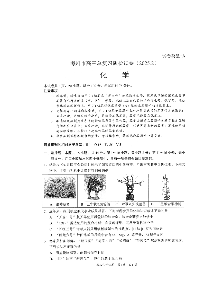 广东省梅州市2024-2025学年下学期高三模拟预测(一)化学