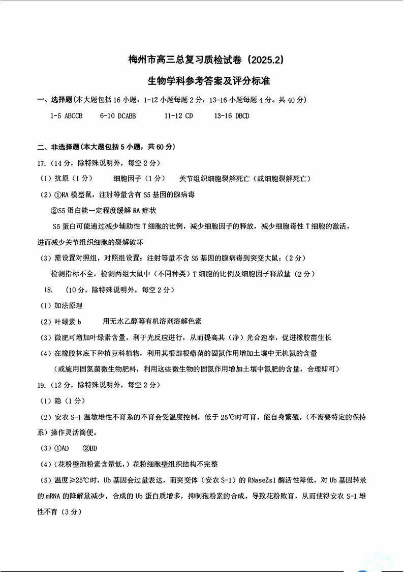 广东省梅州市2024-2025学年下学期高三模拟预测(一)生物答案