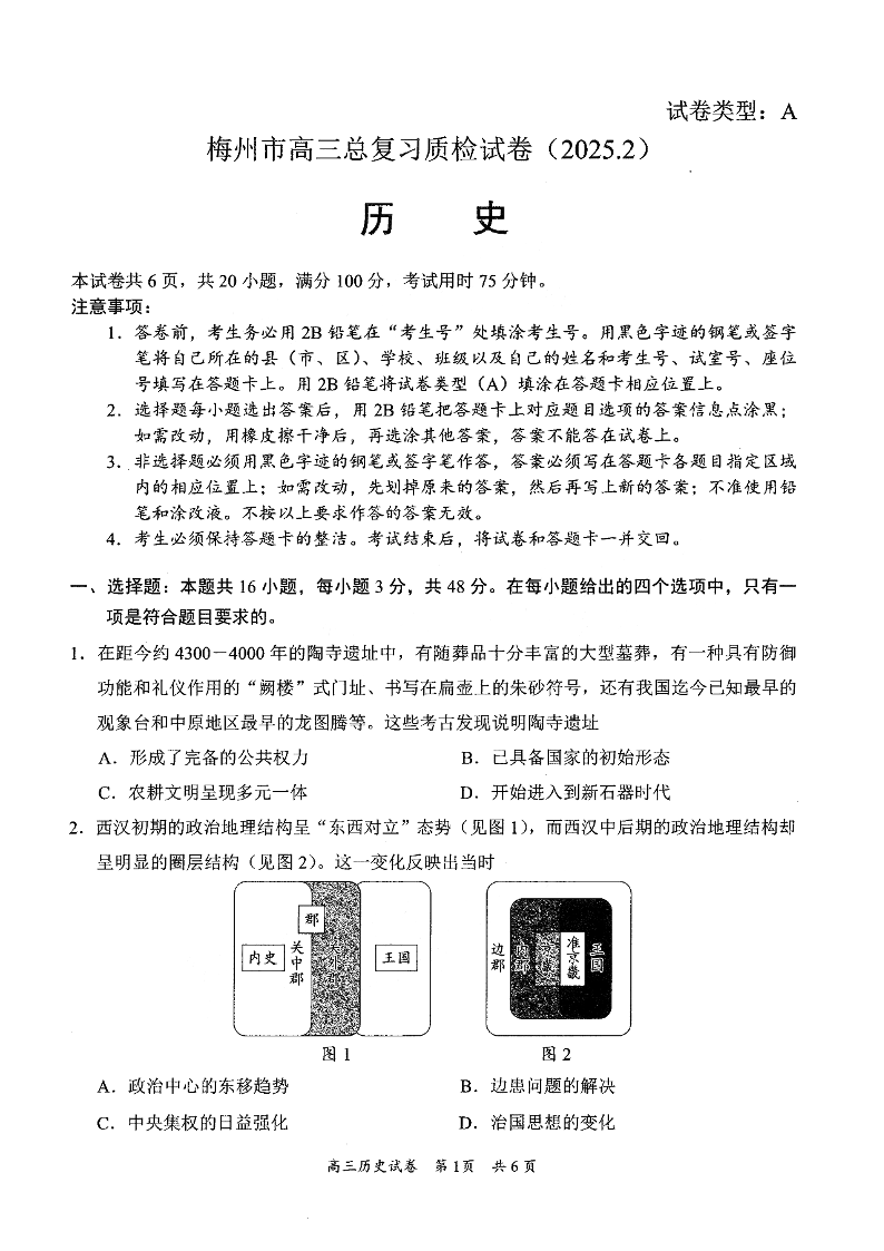 广东省梅州市2024-2025学年下学期高三模拟预测(一)历史