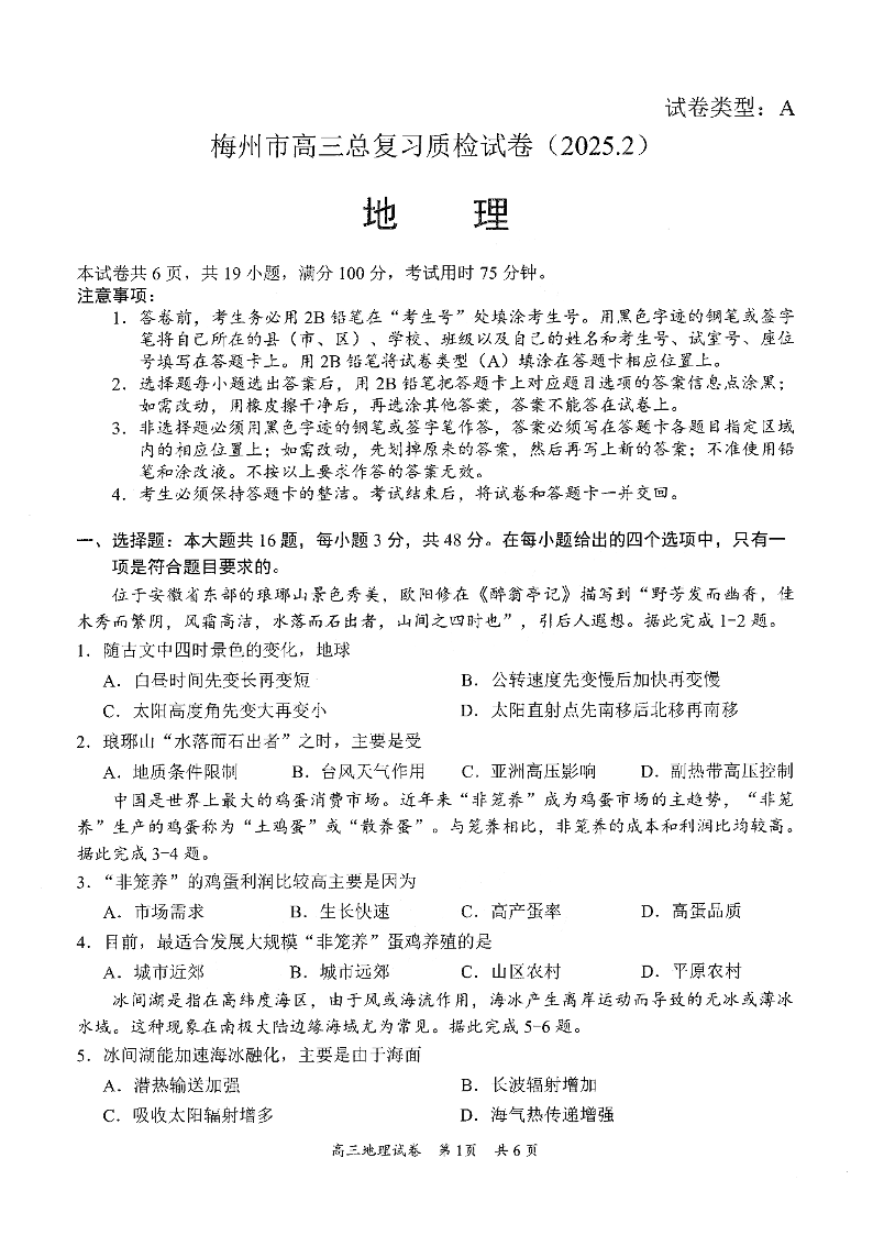 广东省梅州市2024-2025学年下学期高三模拟预测(一)地理+答案