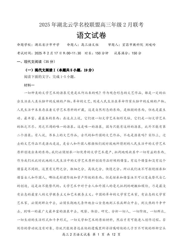湖北省云学名校联盟2024-2025学年下学期2月高三联考语文