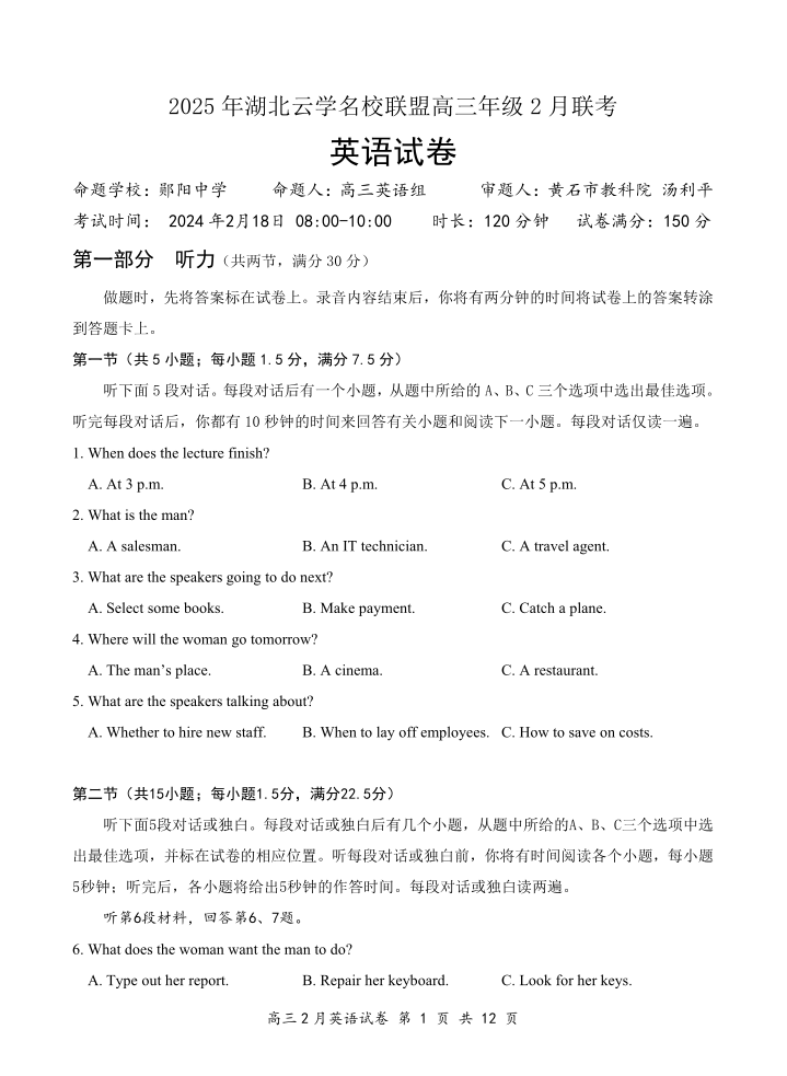 湖北省云学名校联盟2024-2025学年下学期2月高三联考英语