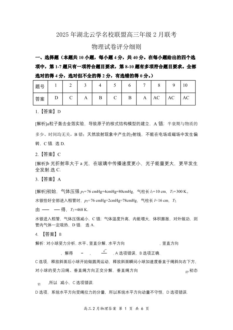 湖北省云学名校联盟2024-2025学年下学期2月高三联考物理答案