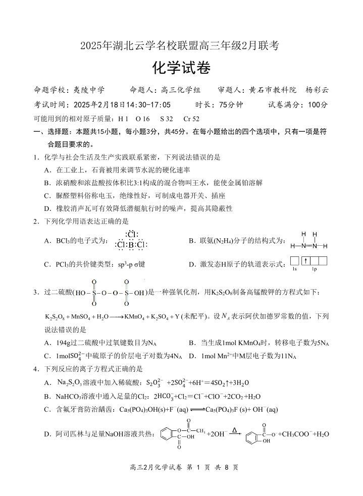 湖北省云学名校联盟2024-2025学年下学期2月高三联考化学