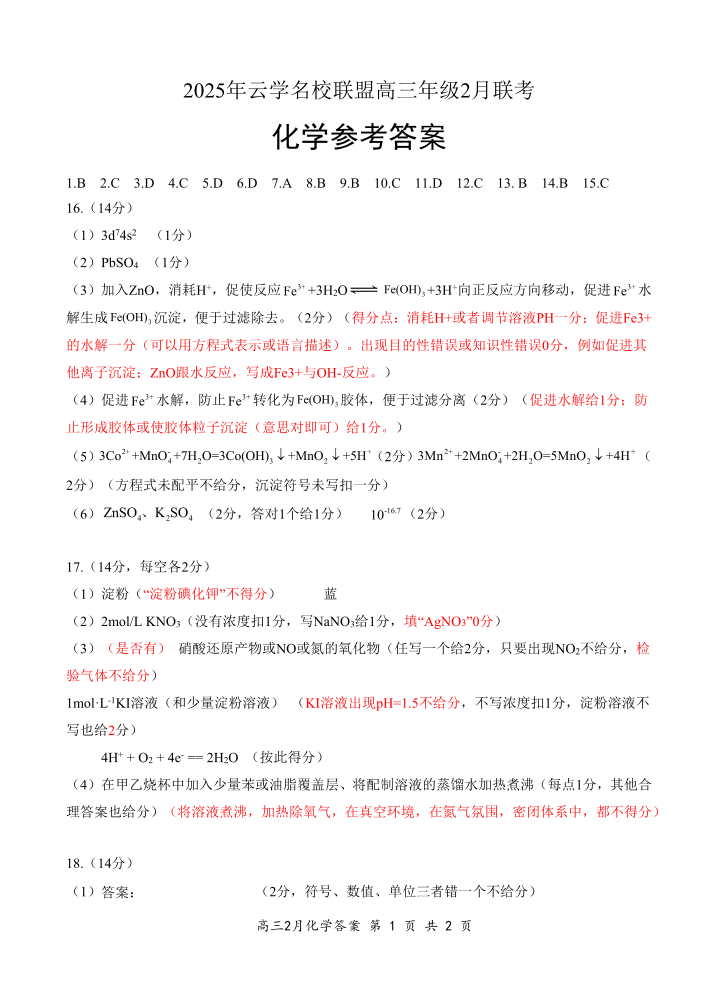 湖北省云学名校联盟2024-2025学年下学期2月高三联考化学答案