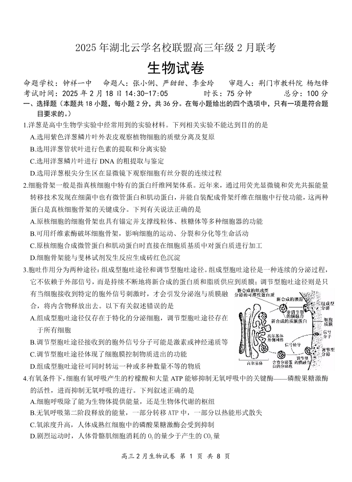 湖北省云学名校联盟2024-2025学年下学期2月高三联考生物