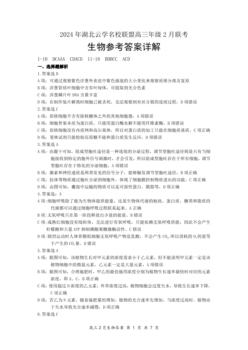 湖北省云学名校联盟2024-2025学年下学期2月高三联考生物答案