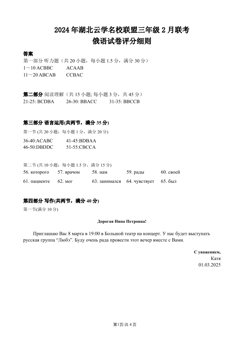 湖北省云学名校联盟2024-2025学年下学期2月高三联考俄语答案