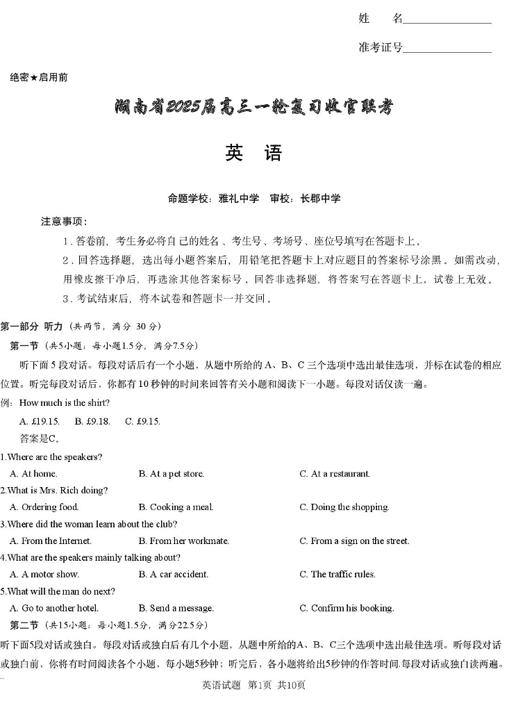 湖南省2024-2025学年下学期高三一轮复习收官联考英语