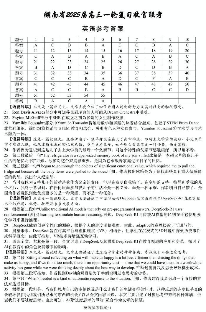 湖南省2024-2025学年下学期高三一轮复习收官联考英语答案