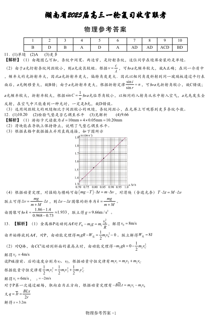 湖南省2024-2025学年下学期高三一轮复习收官联考物理答案