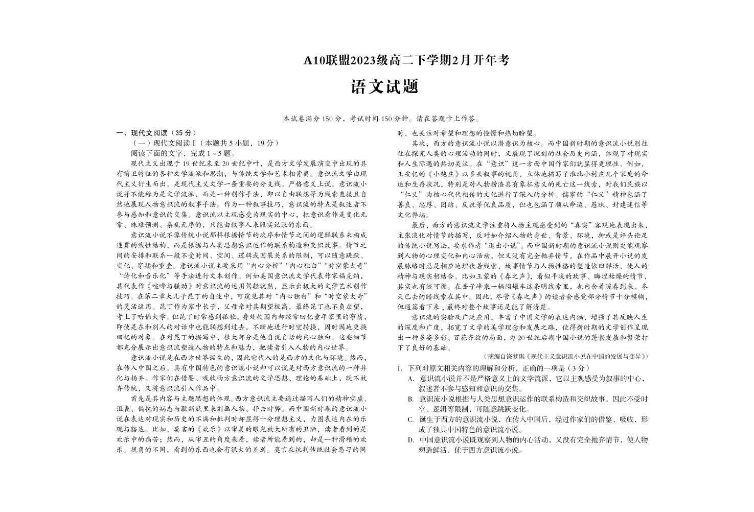 安徽省A10联盟2024-2025学年高二下学期2月开学考试语文+答案