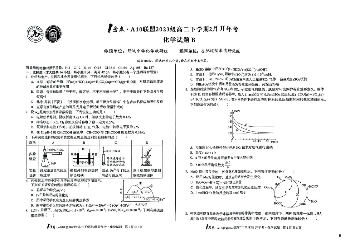 安徽省A10联盟2024-2025学年高二下学期2月开学考试化学+答案