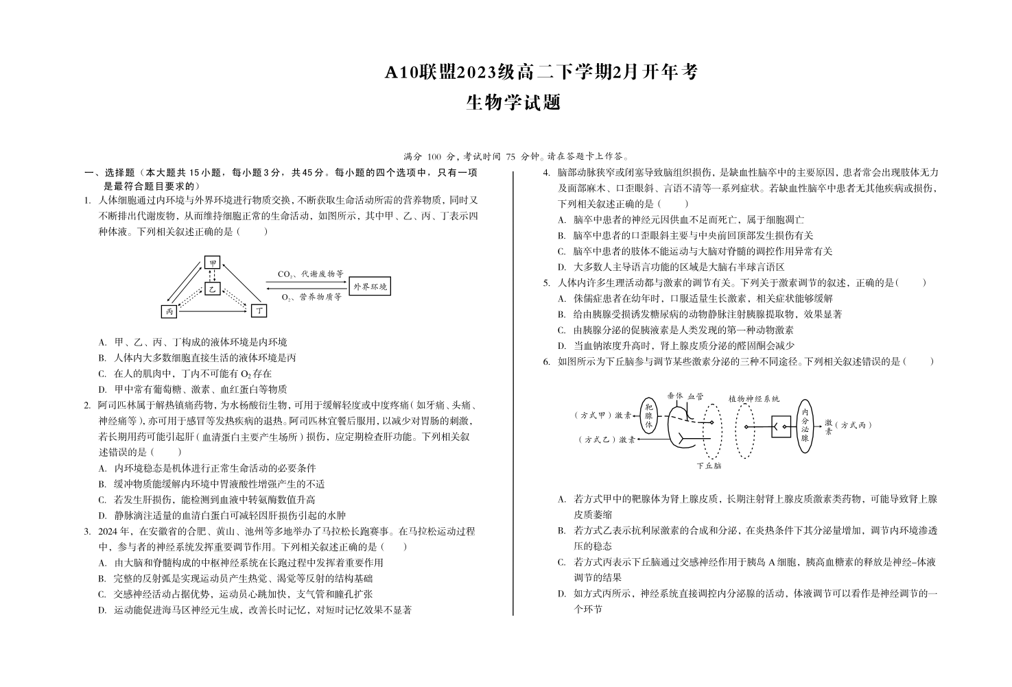 安徽省A10联盟2024-2025学年高二下学期2月开学考试生物+答案