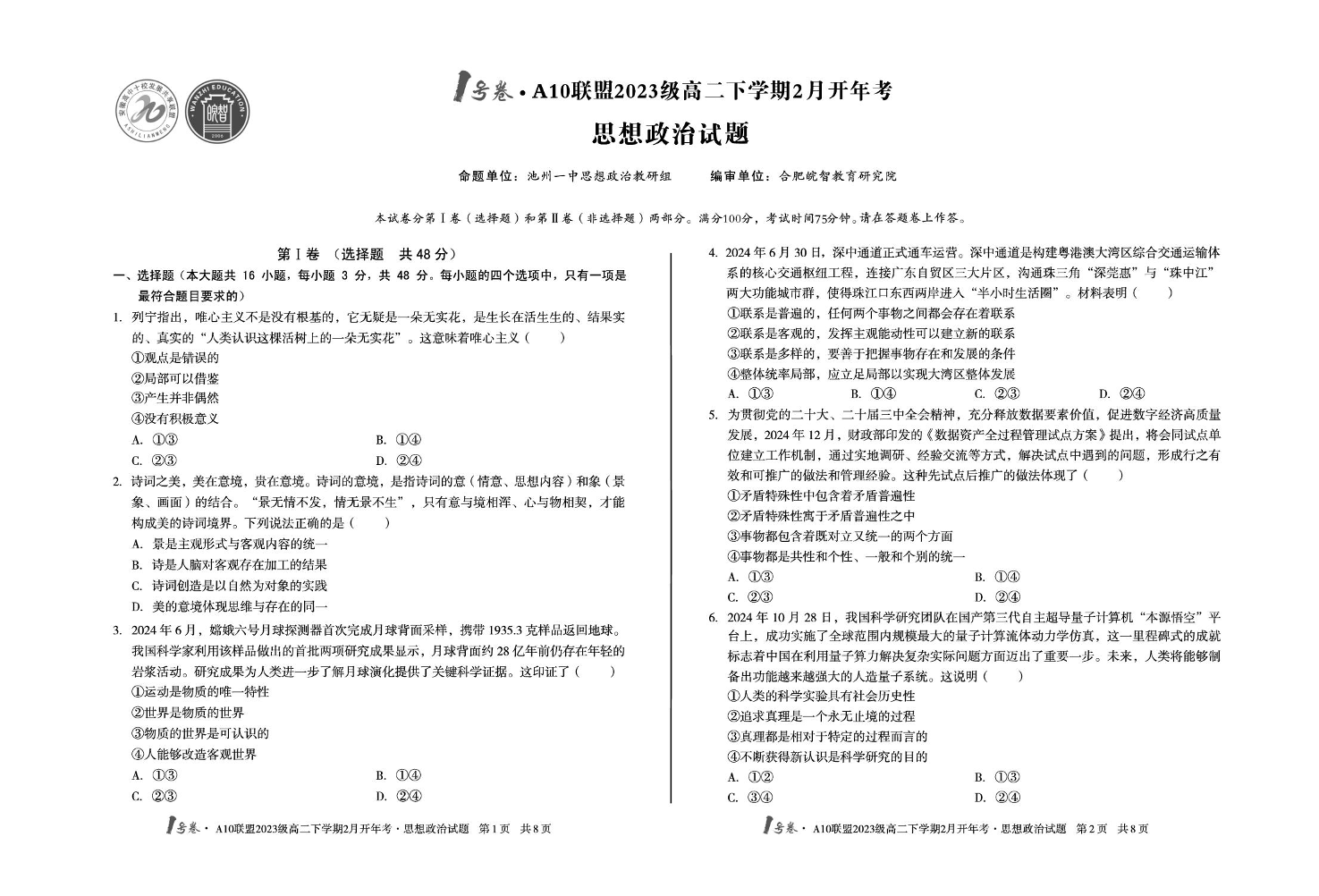 安徽省A10联盟2024-2025学年高二下学期2月开学考试政治+答案