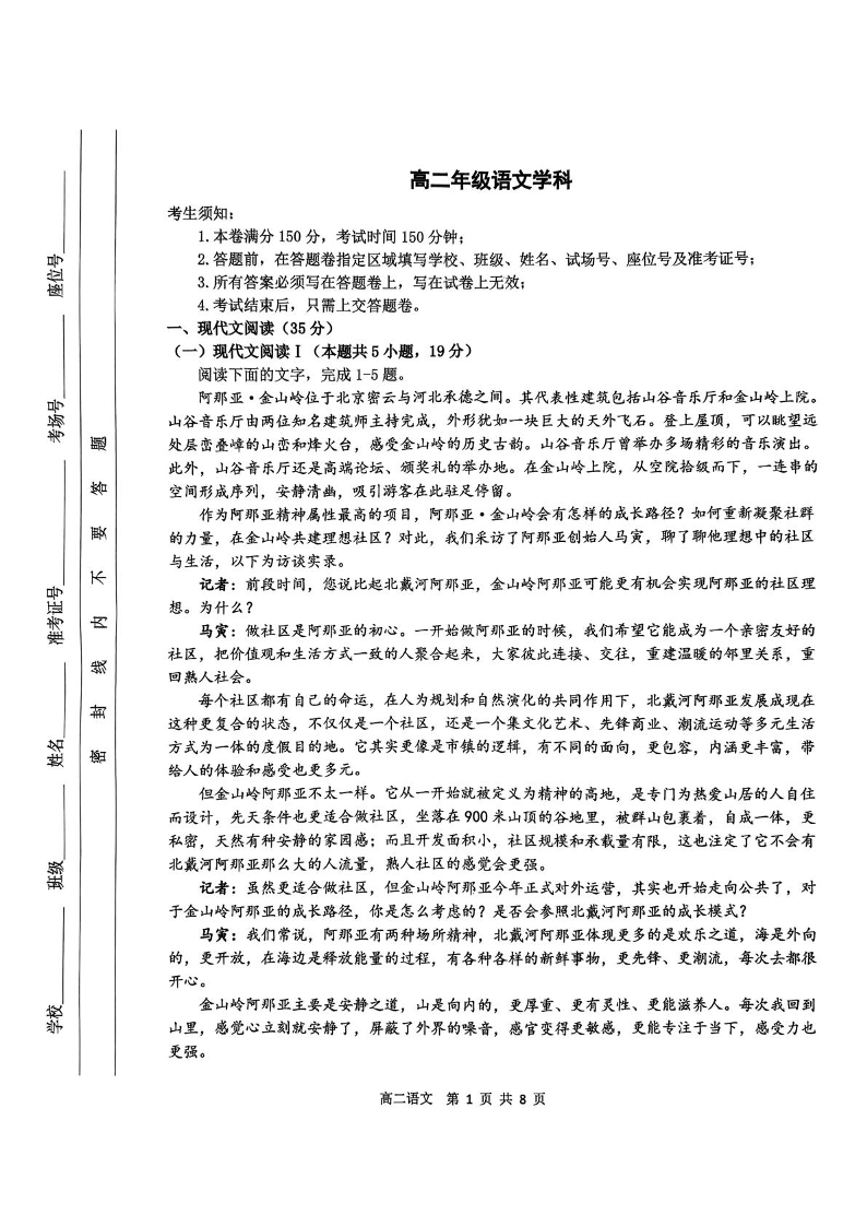 浙江省杭州市部分重点中学2024-2025学年高二下学期开学考试语文+答案