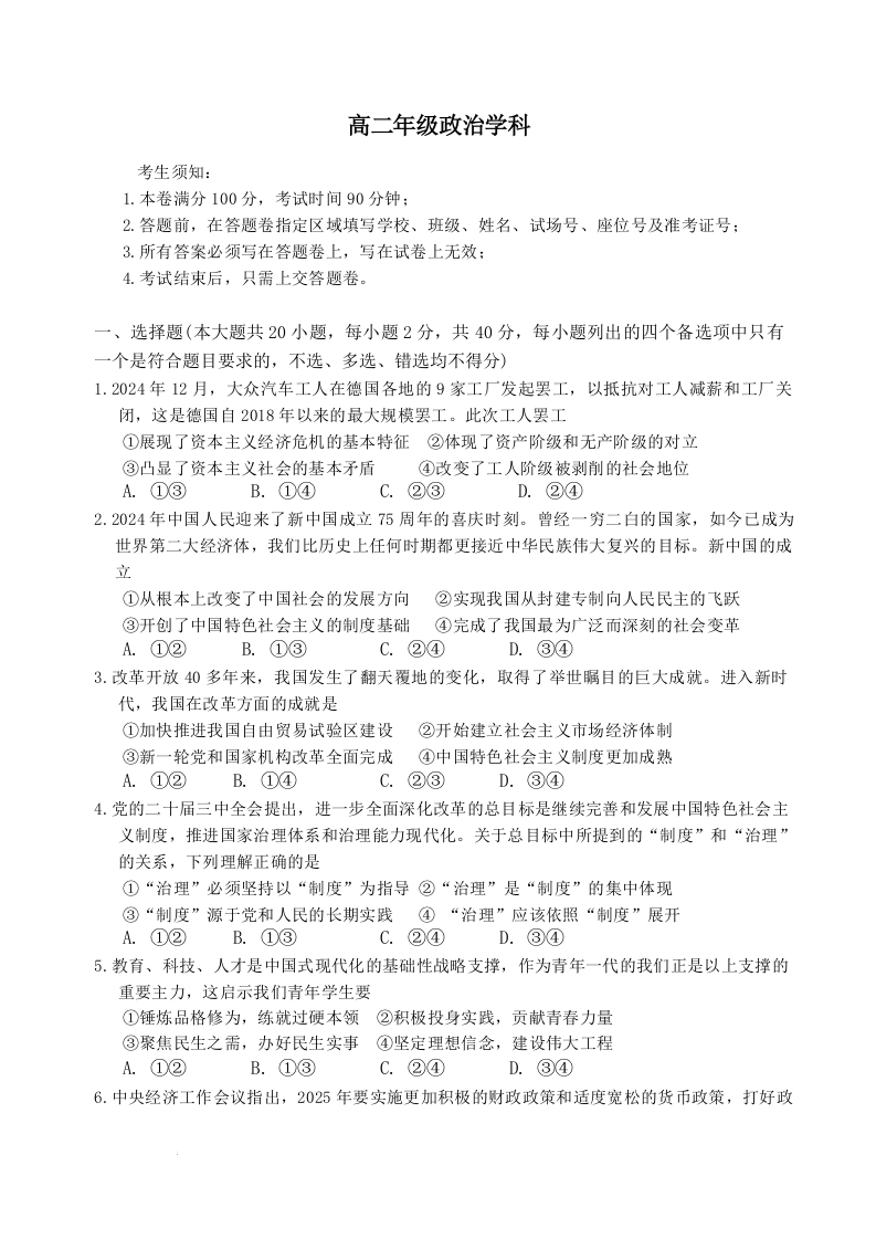 浙江省杭州市部分重点中学2024-2025学年高二下学期开学考试政治