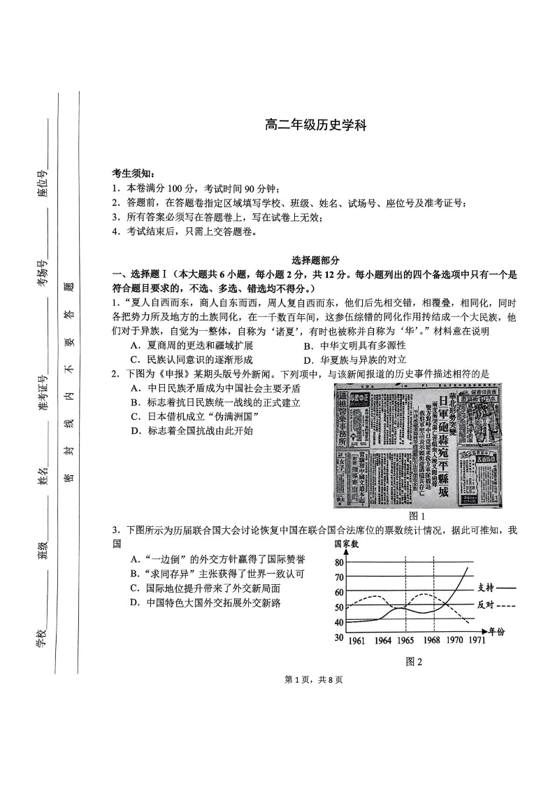 浙江省杭州市部分重点中学2024-2025学年高二下学期开学考试历史+答案
