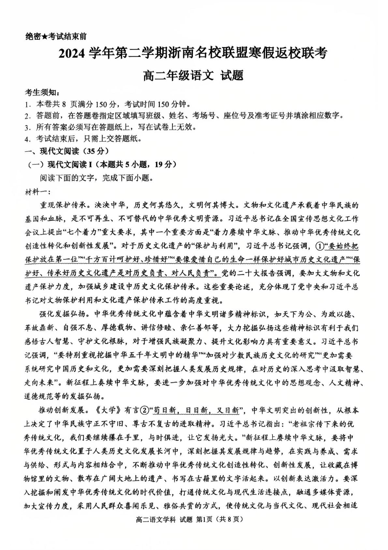 浙江省温州市浙南名校联盟2024-2025学年高二下学期2月开学考试语文+答案