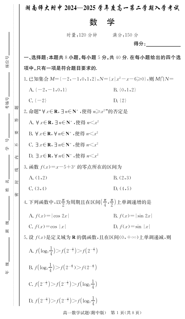 湖南省师范大学附属中学2024-2025学年高一下学期入学考试数学
