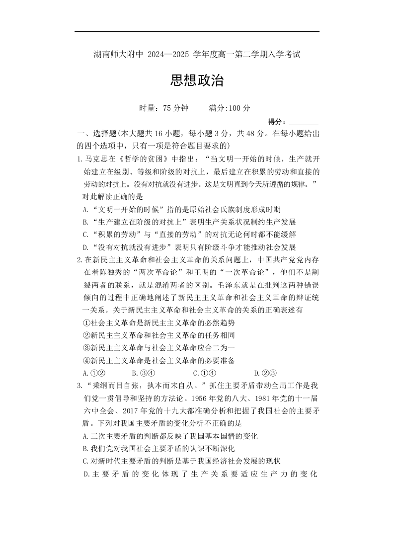 湖南省师范大学附属中学2024-2025学年高一下学期入学考试政治