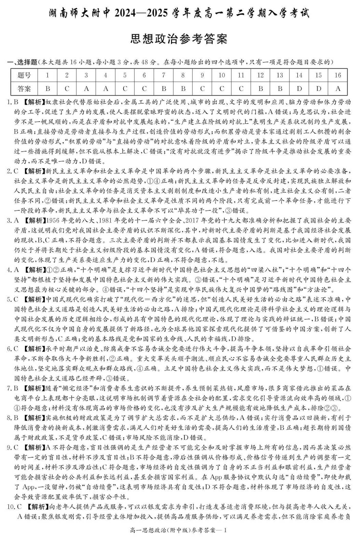 湖南省师范大学附属中学2024-2025学年高一下学期入学考试政治答案