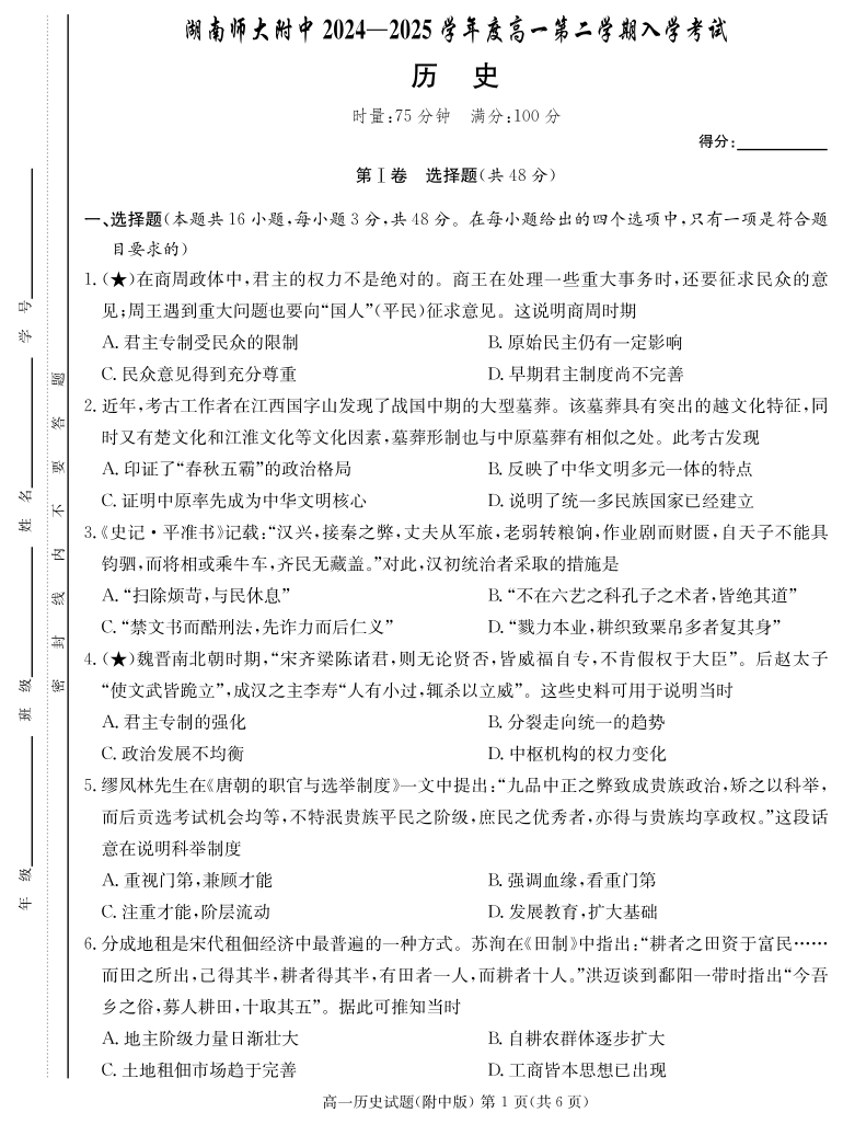 湖南省师范大学附属中学2024-2025学年高一下学期入学考试历史