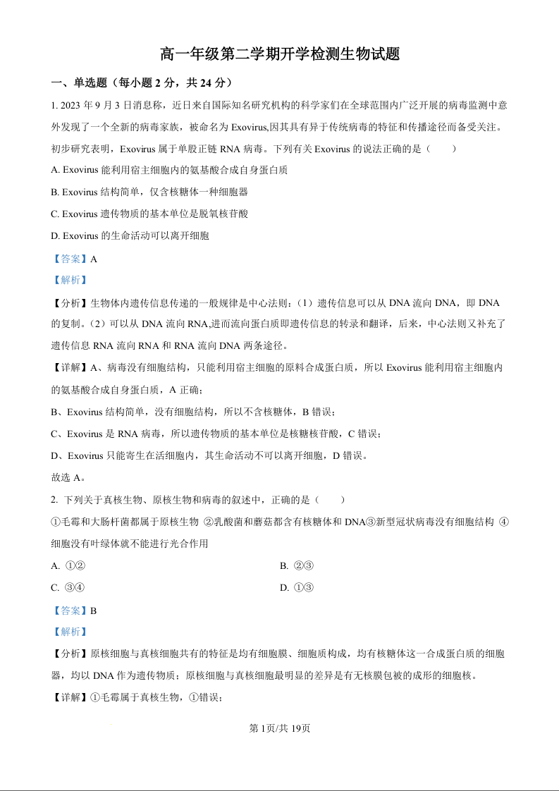 江西省赣州市上犹中学2024-2025学年高一下学期开学考试生物(精品解析版)