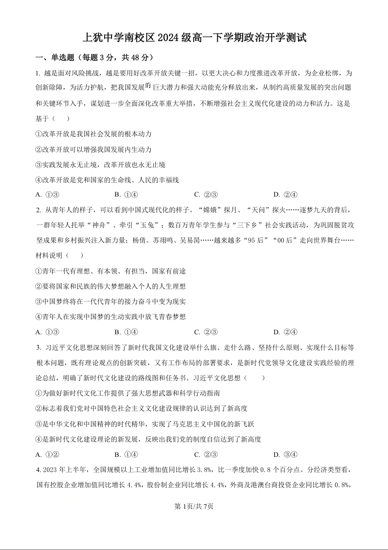 江西省赣州市上犹中学2024-2025学年高一下学期开学考试政治(原卷版)