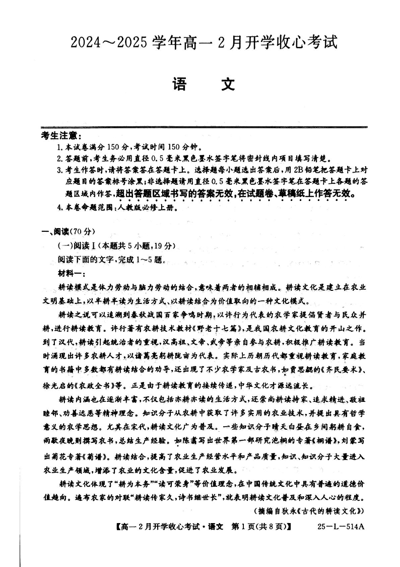 山西省晋城市2024-2025学年高一下学期2月开学考试语文+答案