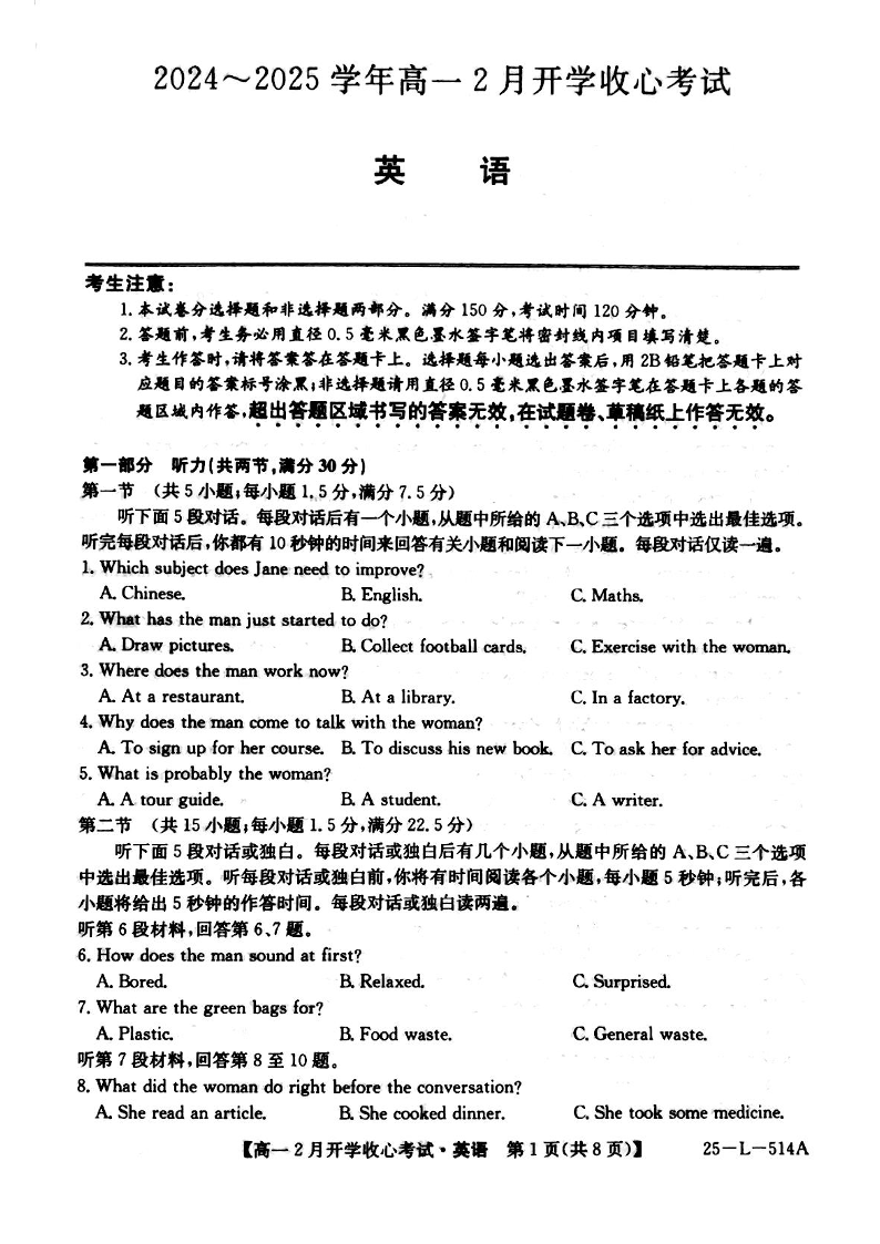 山西省晋城市2024-2025学年高一下学期2月开学考试英语+答案