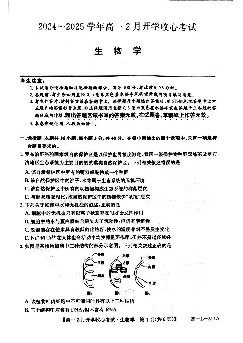 山西省晋城市2024-2025学年高一下学期2月开学考试生物+答案