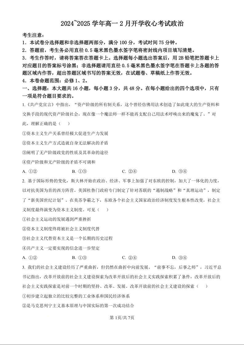 山西省晋城市2024-2025学年高一下学期2月开学考试政治(原卷版)