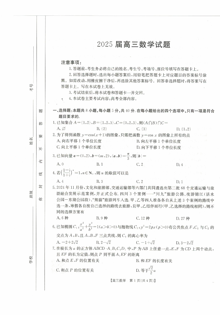 四川省部分学校2024-2025学年下学期2月高三开学考试数学