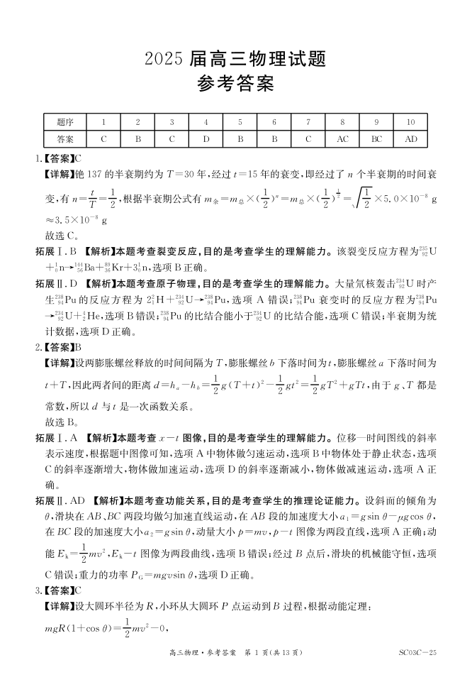 四川省部分学校2024-2025学年下学期2月高三开学考试物理答案