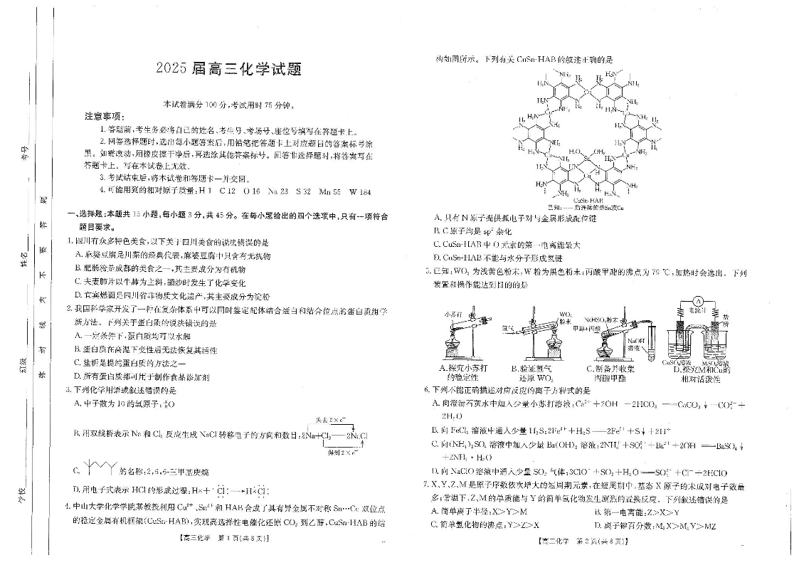 四川省部分学校2024-2025学年下学期2月高三开学考试化学+答案