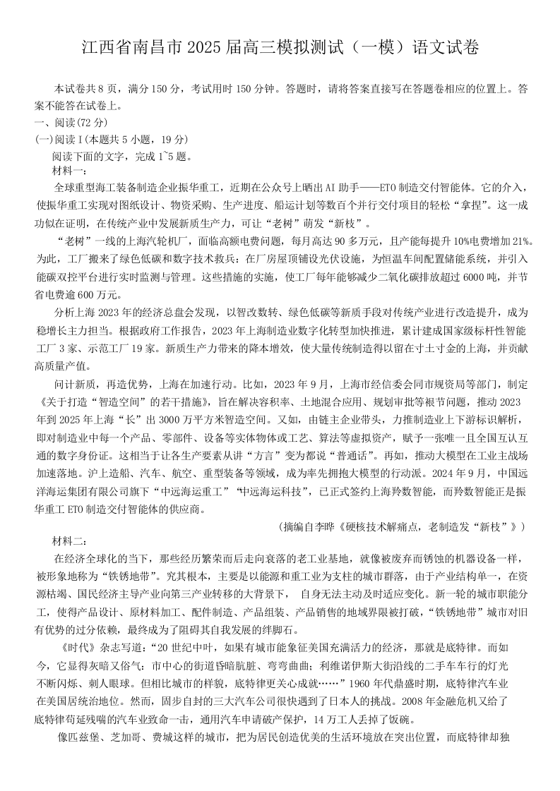 江西省南昌市2024-2025学年高三第一次模拟测试(一模)语文+答案