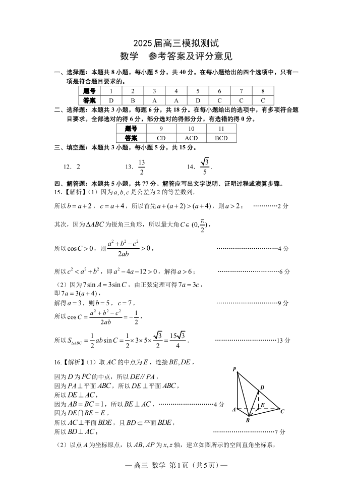 江西省南昌市2024-2025学年高三第一次模拟测试(一模)数学答案