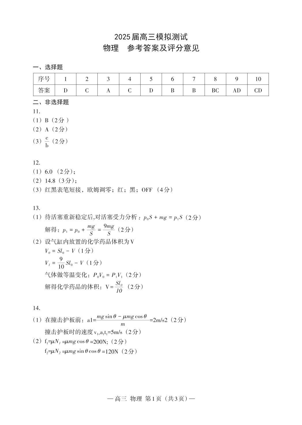 江西省南昌市2024-2025学年高三第一次模拟测试(一模)物理答案