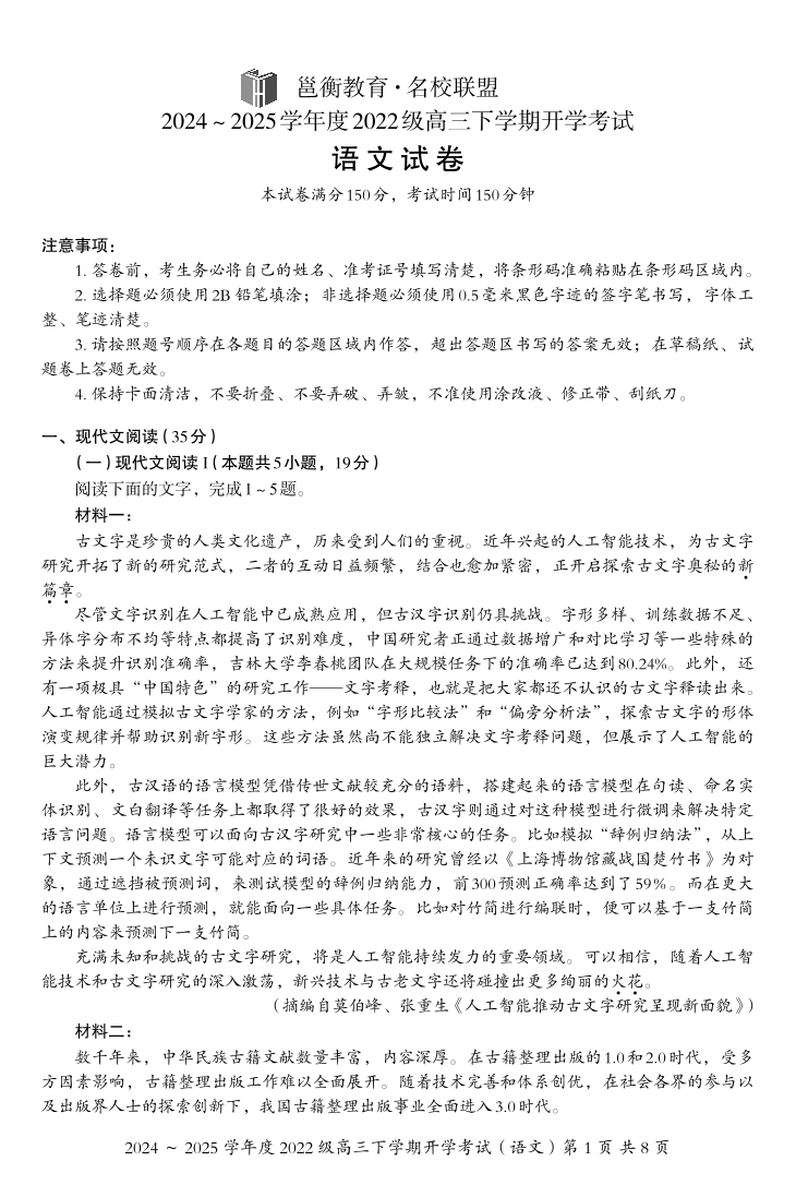 广西省邕衡教育·名校联盟2024-2025下学期高三开学考试语文