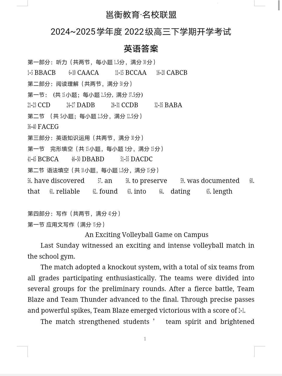广西省邕衡教育·名校联盟2024-2025下学期高三开学考试英语答案