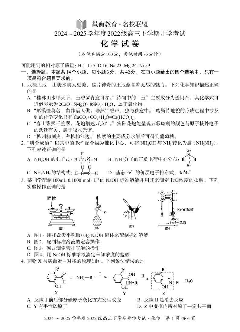 广西省邕衡教育·名校联盟2024-2025下学期高三开学考试化学