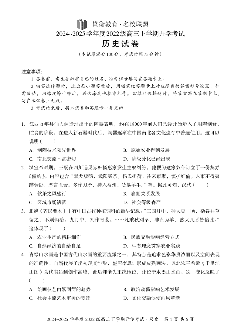 广西省邕衡教育·名校联盟2024-2025学年下学期高三开学考试历史